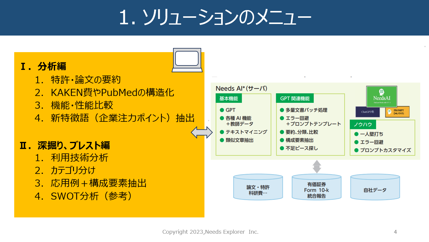 ニーズエクスプローラ社は企業経営、知財コンサル、研究所、ソフト開発のベテランが、生成AIや自然言語処理関連ツールの導入と知財業務への適用(プロンプト開発・保守)をご支援いたします。