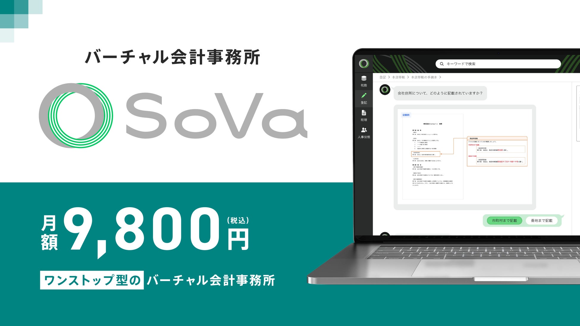 「SoVa」は、月額9,800円のワンストップ型バーチャル会計事務所です。
