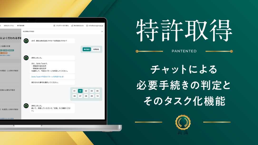 株式会社SoVa(本社:東京都中央区、代表取締役:山本健太郎)が運営するバーチャル会計事務所「SoVa」は、税務・労務・経理・登記などのバックオフィス関連サービス「SoVa」の情報処理技術に関する特許を取得したことをお知らせいたします。