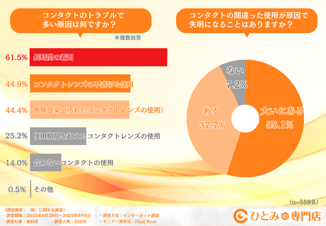 続いて、『コンタクトレンズの不適切な使用(44.9%)』『角膜感染(汚れたコンタクトレンズの使用)(44.4%)』『使用期限を超えたコンタクトレンズの使用(25.2%)』『合わないコンタクトの使用(14.0%)』と続きました。