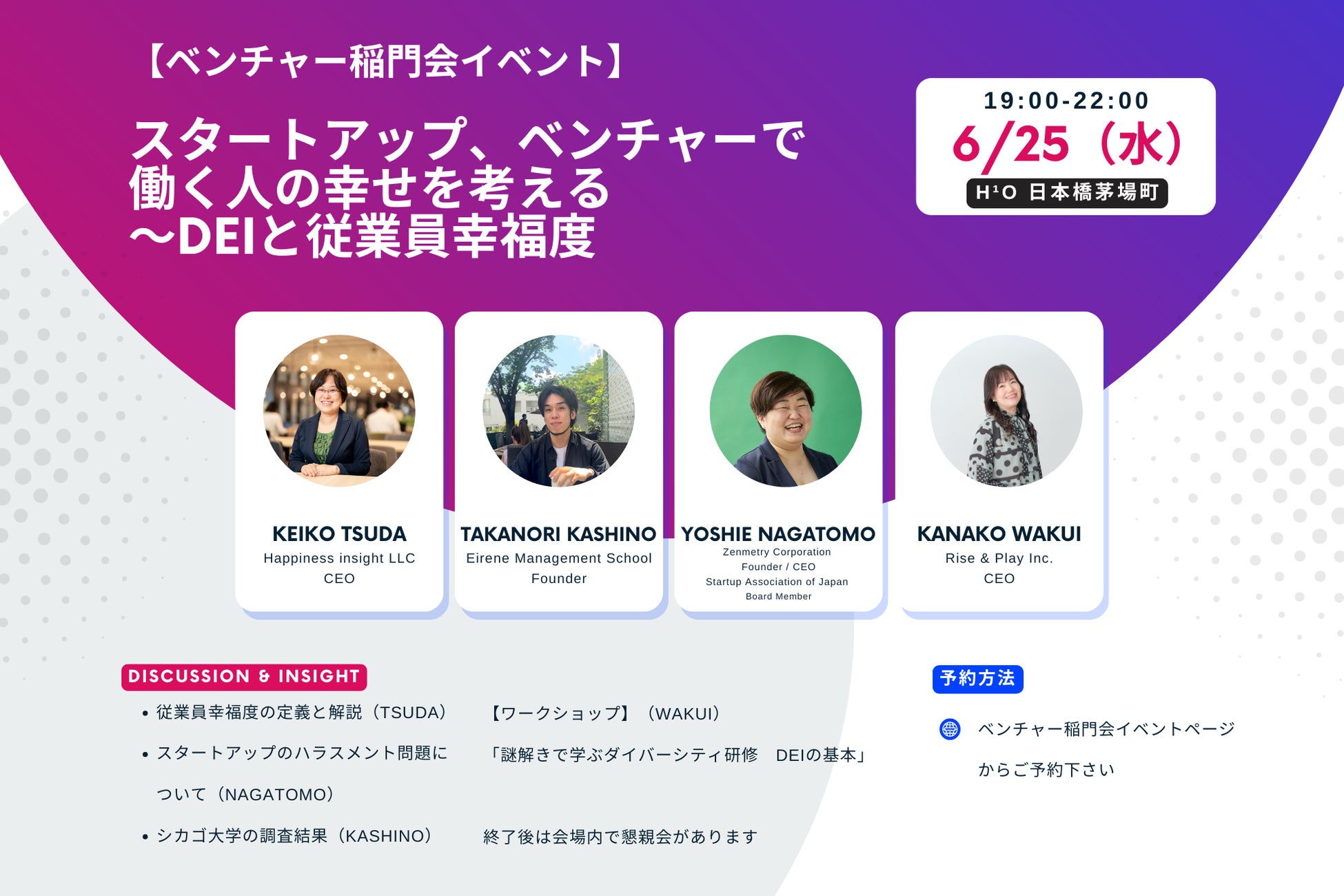 早稲田大学出身の起業家で構成されるベンチャー稲門会は、2025年6月25日(水)にH¹O 日本橋茅場町にて、「スタートアップ・ベンチャーで働く人の幸せを考える」をテーマにしたトークイベント&ワークショップを開催します。