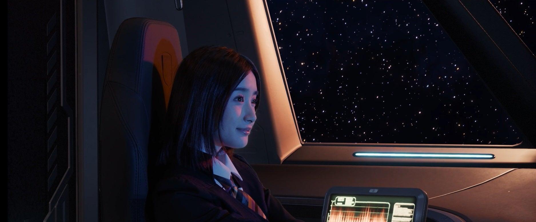 今回、エイベックス・エンタテインメント株式会社様により撮影・企画されたこのショートムービーは、いつか来るかもしれないしれない未来のタクシー車両、ドライバーの姿、お客様の楽しみ方、観光の形を表現するものとなり、初めて完成の動画を見た際はそのリアルさに大変驚きました。また、主演を務めてくださった安倍乙さんの繊細な表現により、広い宇宙を進むドライバーの気持ちが見ている方に伝わる作品になったかと思います。