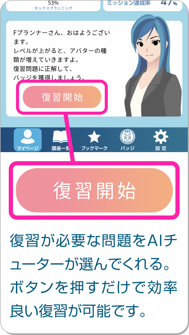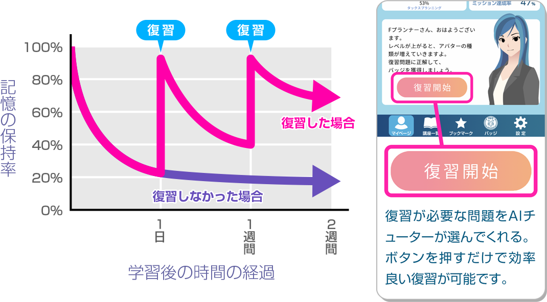 学習から練習問題・実技形式の問題まで、スマホアプリ1つで完結します。さらに記憶の定着に必要な『復習』をAIがサポートします。