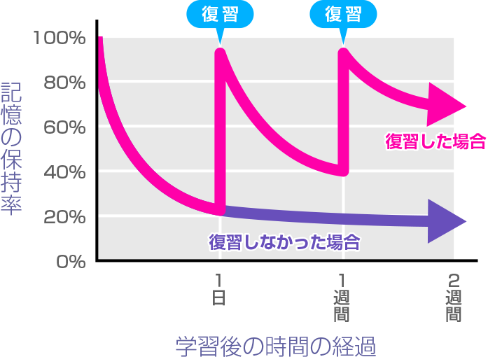 ドイツの心理学者エビングハウスの実験では、1時間後に56%、1日後に74%、1週間後に77%を忘れるという結果が出ました。これが「エビングハウスの忘却曲線」です。