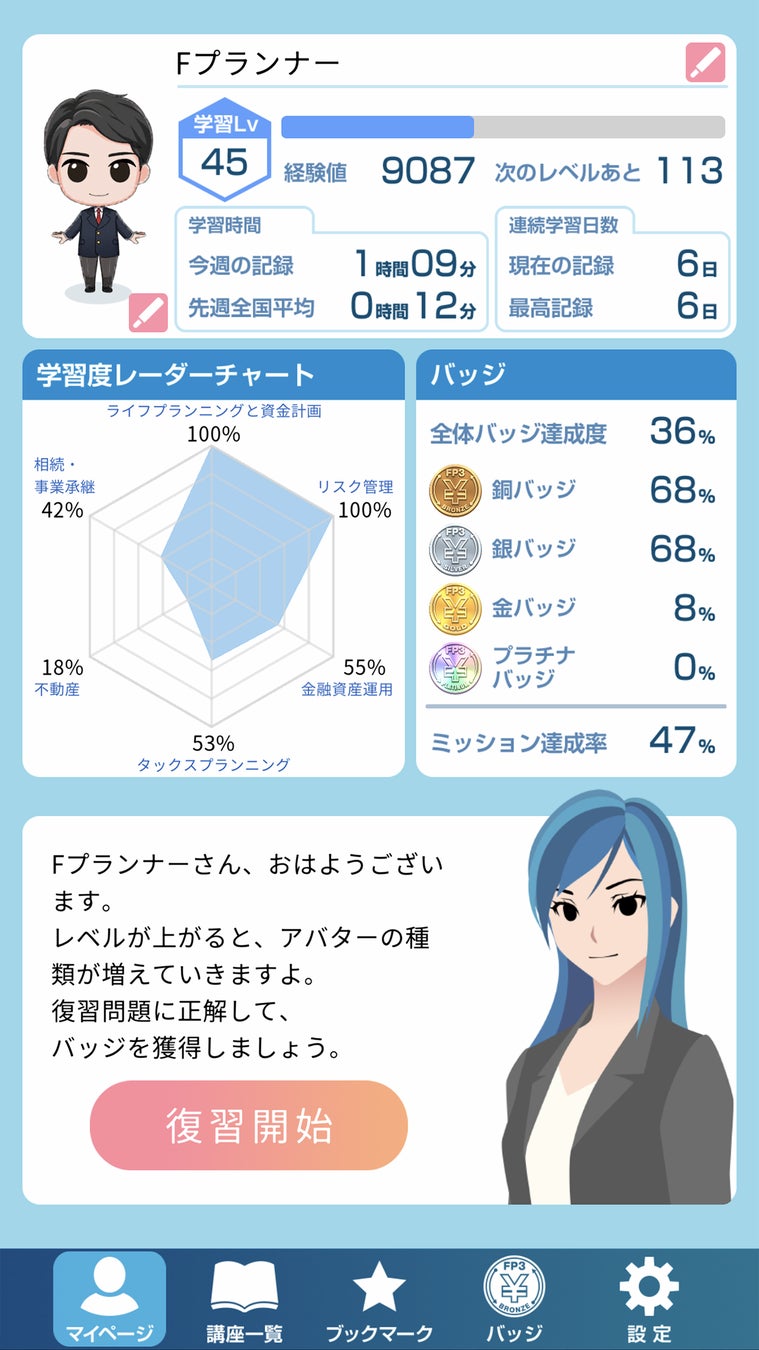 学習を進め、問題を解き、さらに復習をおこなうことで経験値を獲得し、一定値に達すると学習レベルがアップします。また、設定されたミッションをクリアすることで、バッジを取得します。学習がどれくらい進んでいるのかが一目で分かり、モチベーションアップに繋がります。