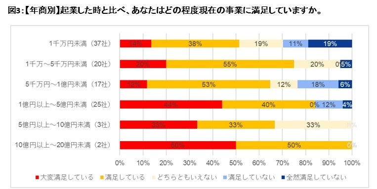 3.年商と満足度の関係:満足度は売上が大きくなると高まる傾向にあります。 年商が1億円以上の企業では、「大変満足」「満足」の評価をしたスタートアップが過半数でした。統計的に分析しても、満足度と売り上げには相関関係が見られました。