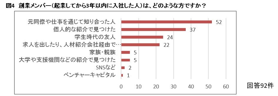 4.創業メンバーの変化:創業メンバーは、仕事関係や友人が主でトップ3を占め、その次は求人や人材紹介会社経由での採用となりました。現在も会社に残る創業メンバーについて聞いたところ、半分以上残っているのが81%でした。メンバーが抜けた理由は「能力の不足(17人)」「方向性の違い(16人)」が、「給与を十分払えなかった(8人)」を上回りました。