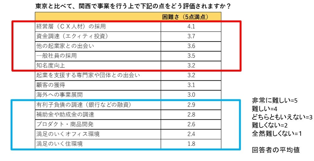 5.東京と比べて、関西で事業を行う上での困難トップ5(赤枠)は、1位「経営層(CX人材)の採用」、2位「資金調達(エクィティ投資)」、3位「ほかの起業家との出会い」、4位「一般社員の採用」、5位「知名度向上」でした。経営層の採用が難しいという話は、頻繁に聞きます。資金調達の困難さは、日本のベンチャーキャピタル(VC)の7割が東京に集中していることも起因すると思われます。一方、困難度は低い(青枠)は、有利子負債の調達や補助金・助成金の調達、プロダクト・商品開発、オフィス環境や住環境などでした。ヒト・モノ・カネの中で、ヒト・カネはまだ困難であるものの、モノについて、特にオフィスや住環境については関西のほうが良いという意見もよく聞かれます。