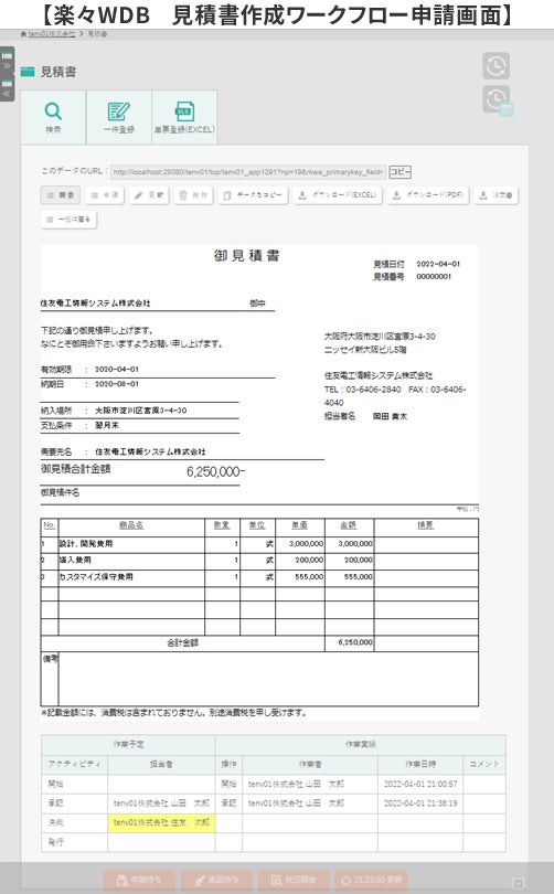 ワークフロー機能を利用すれば、楽々WDBに登録されたデータに承認業務を追加することが可能になります。たとえば見積書の作成業務に承認業務を追加することで、担当者による見積書作成と申請から、上長による承認までのワークフローをペーパーレスで実現できます。