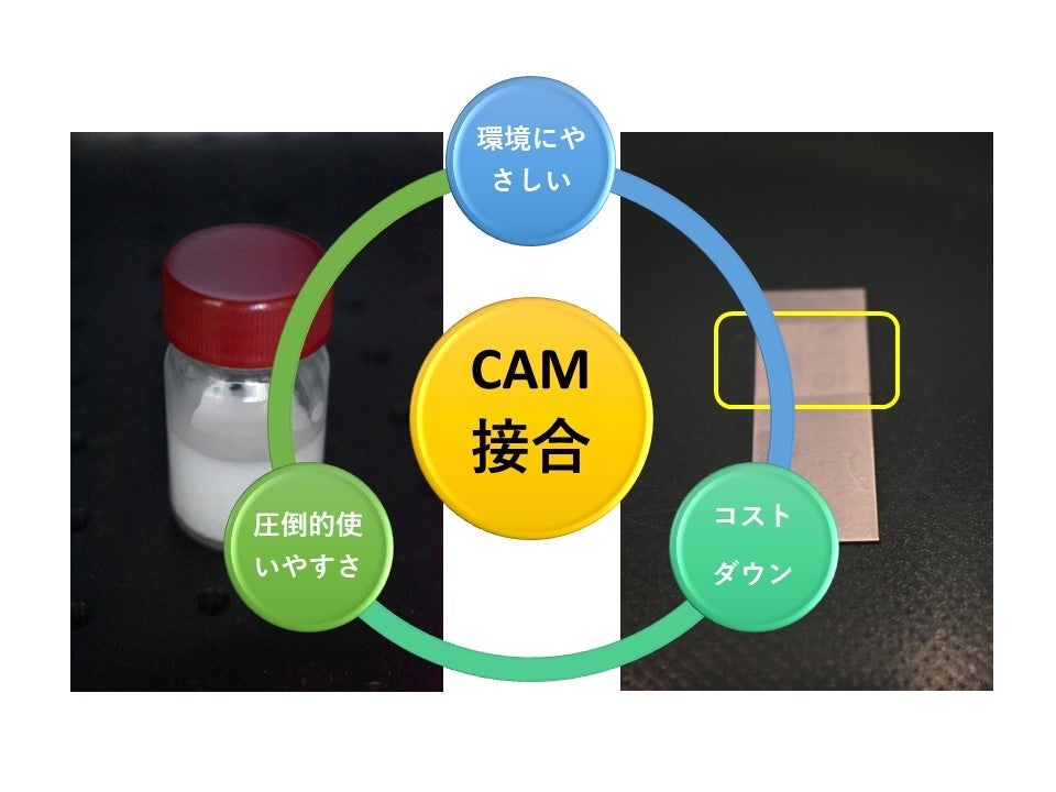 「CAM接合」は従来の接着剤や金属表面処理を行わずに環境負荷を無くして、誰でも簡単に化学結合と溶融結合により、金属とプラスチックを強力に接合する技術です。カーボンニュートラル、カーボンオフセットを目的としたSDGsへの取り組みに適した接合技術になっています。