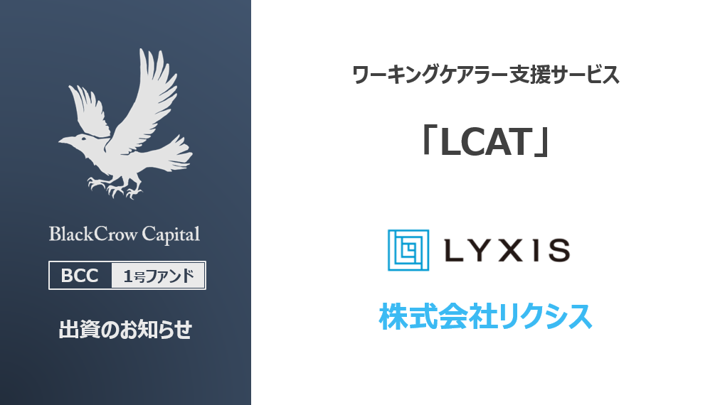 BlackCrow Capital合同会社(代表:菅原 康之、本社:東京都渋谷区)は、同社が運営するBlackCrow Capital 1号投資事業有限責任組合(以下、ブラッククローキャピタル1号ファンド)より、仕事と介護の両立支援プログラム「LCAT」を提供する株式会社リクシスに出資したことをお知らせ致します。今回の株式会社リクシスへの出資により、「LCAT」の早期普及を助け、超高齢化時代の介護離職による労働人口減少の課題解決を図ると共に、仕事をしながら介護を手がける人が大勢になる時代においても、すべての人が自分らしく働き続けられる社会の実現をサポートして参ります。
