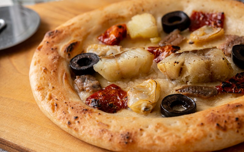 ローストした白身魚(たら)とアンチョビフィレ、あさりを贅沢にトッピング。イタリア産のドライトマトとブラックオリーブが全体の味をさらに奥深くしています。