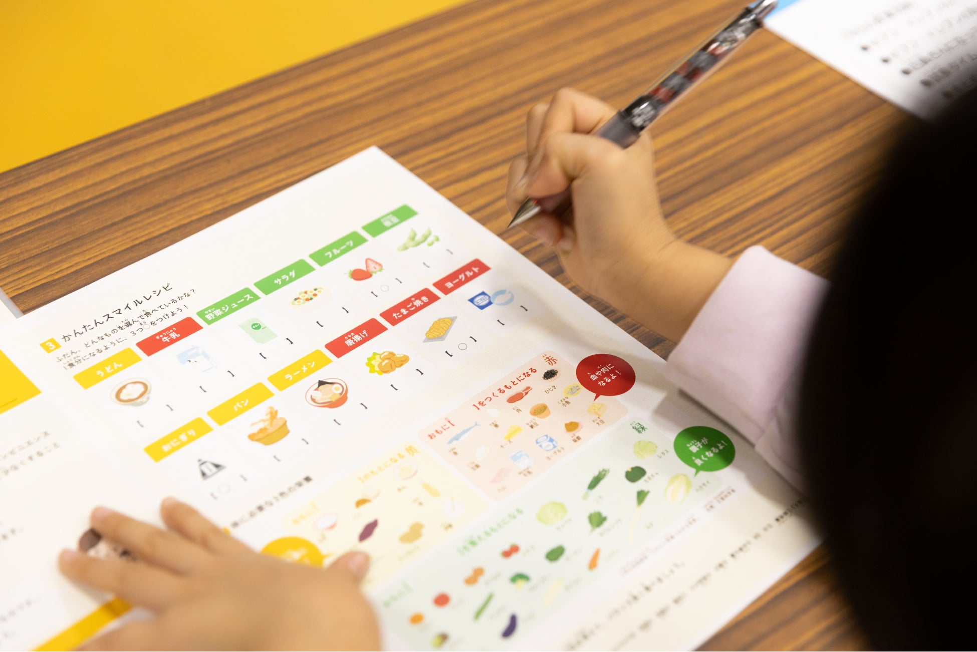 さらに、健康な体をつくる上で大切な栄養を学んだ後、火や包丁を使わずに、コンビニエンスストアでも買える食材を使用し、子どもだけでも簡単に栄養バランスの取れた食事をつくることができるスマイルレシピも紹介しました。(スマイルレシピで使用する食材は最後にお土産としてお渡しし、家でお料理にチャレンジしてもらいます。)