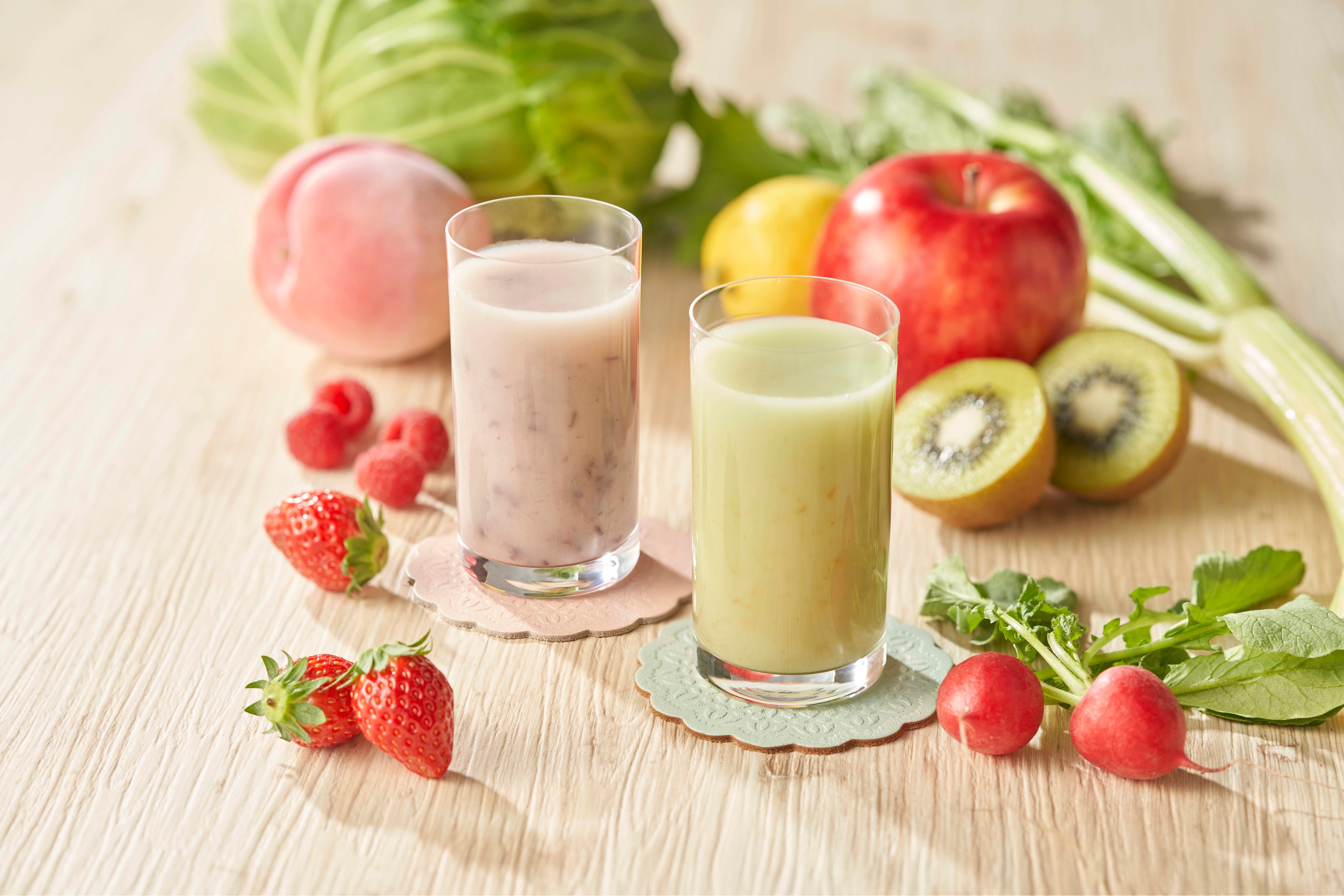 どちらのフレーバーにも、果物と野菜を計12種類ブレンドし、フルーツ果肉の食感が楽しめる飲みやすい味わいです。