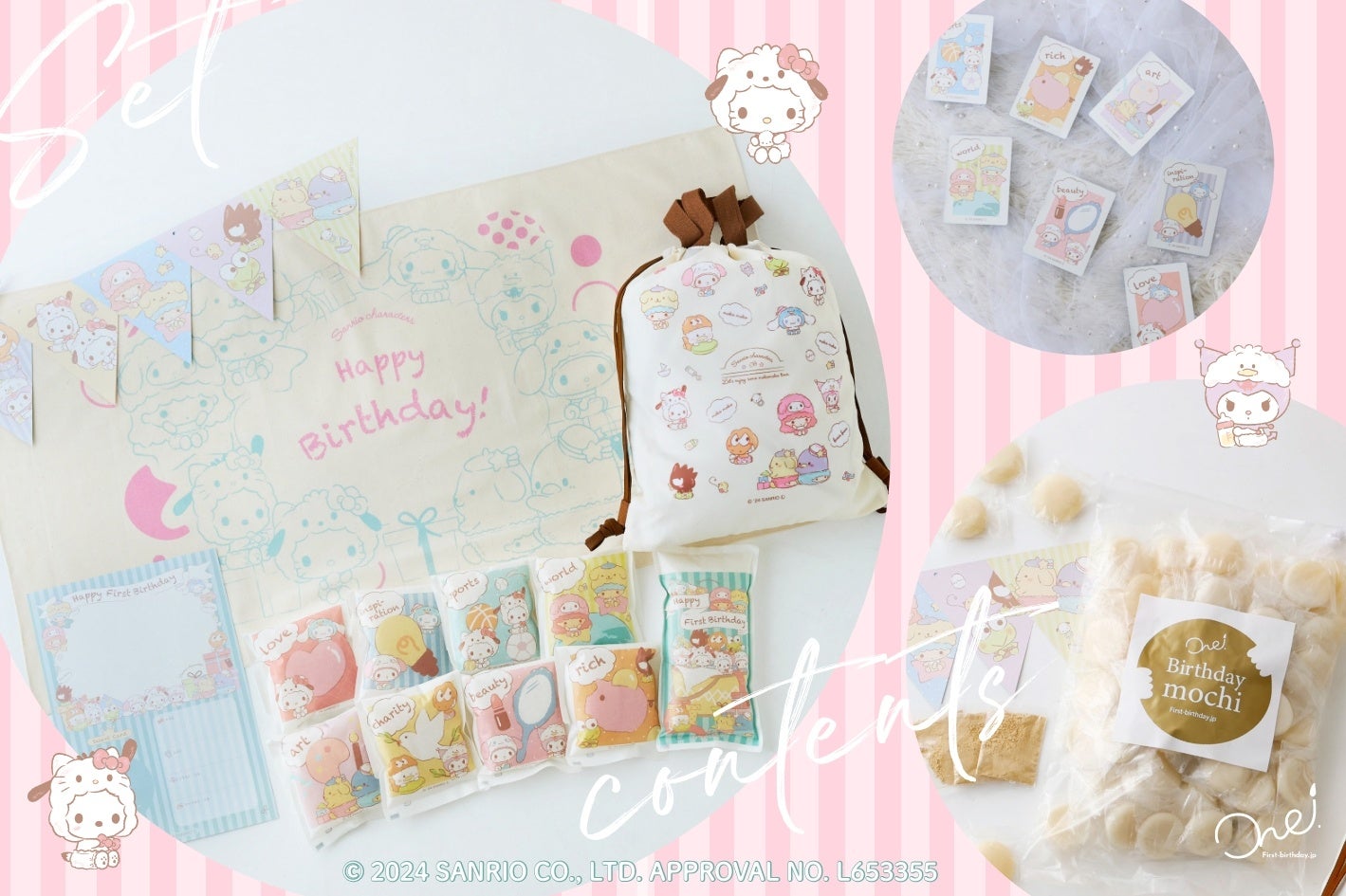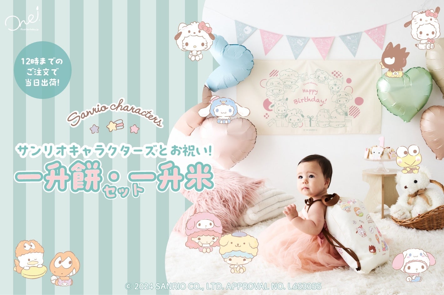 1歳のお誕生日はお任せ!一升餅・一升米のお祝いに必要なものがすべて揃った人気のセットが、サンリオキャラクターデザインで新登場。かわいい人気キャラクターとファーストバースデーをお祝いしよう!
