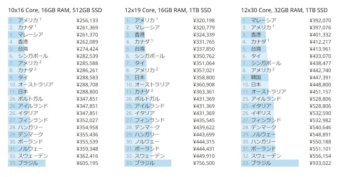 新型MacBook Pro 14インチが安い国上位11か国と、下位10か国の結果はこちら。すべての国が揃った完全なランキングはNukeniウェブサイトを参照。