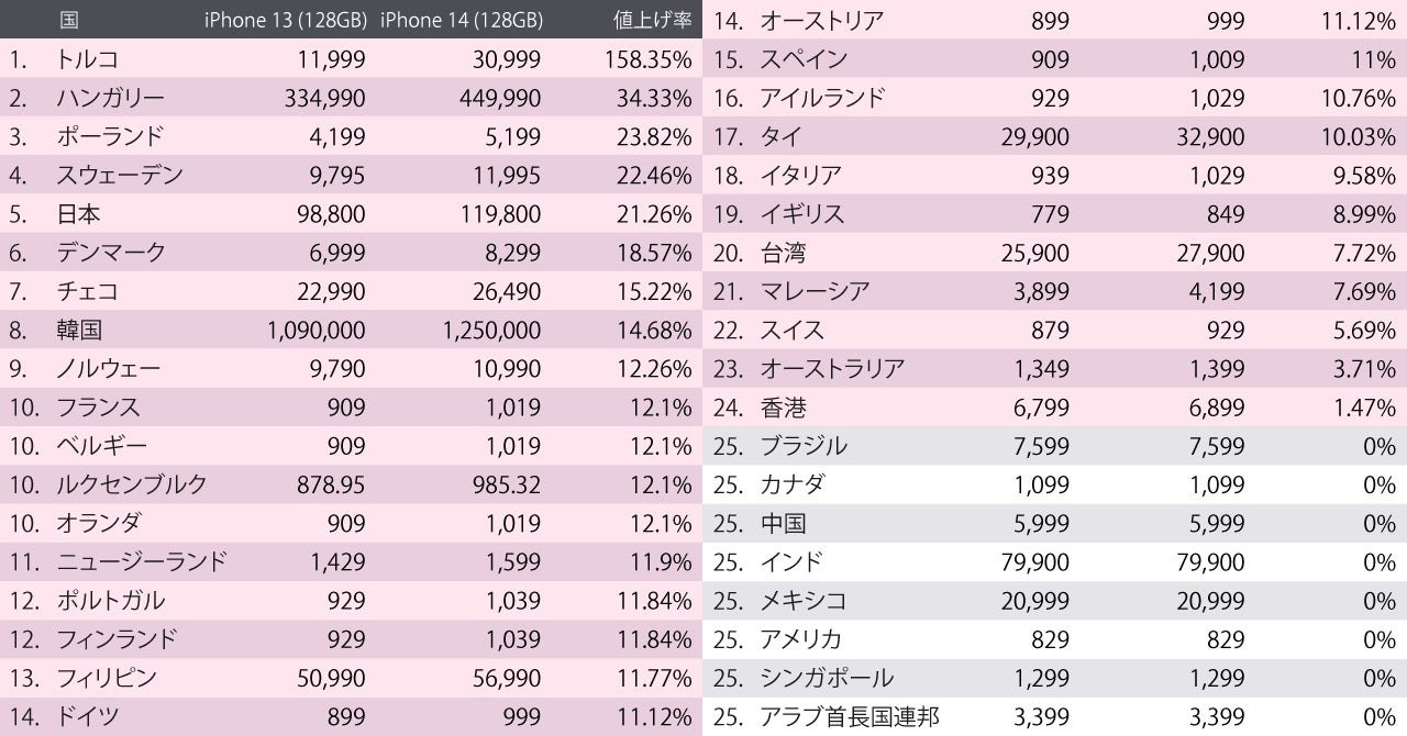 2022年9月16日発売のiPhone 14発売時の調査では37か国中29か国で値上げが実施された。