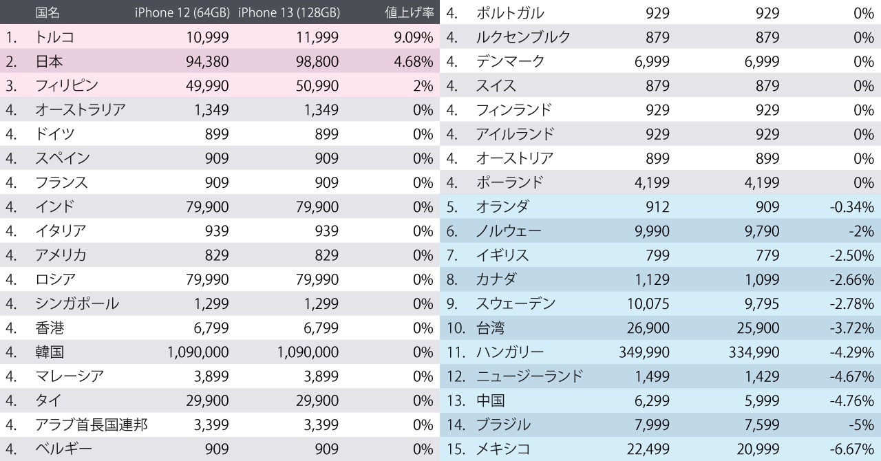 2021年9月24日発売のiPhone 13発売時の調査では多くの国が価格を維持、もしくは値下げが実施された。値上げが行われたのは日本を含む3か国のみ。