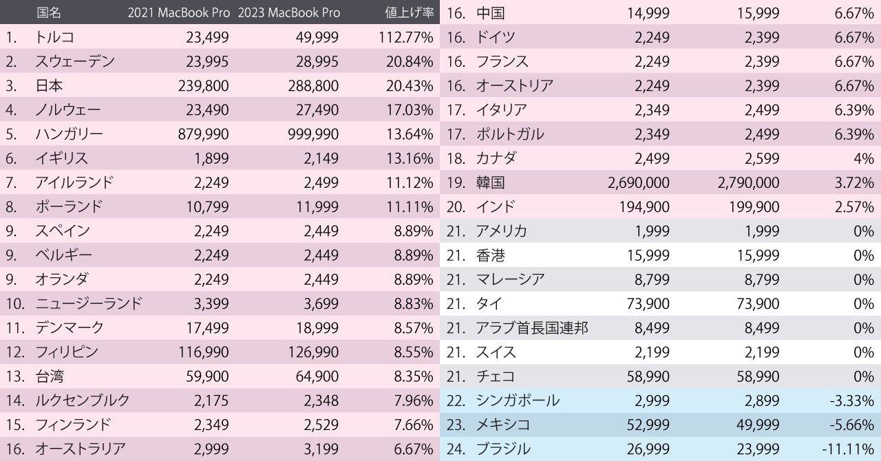 以下の図は新旧14インチMacBook Proのエントリーモデルの価格を比較した結果である。27か国で価格が上昇し、アメリカを含む7か国は価格を維持。シンガポール、メキシコ、ブラジルでは値下げが実施された。