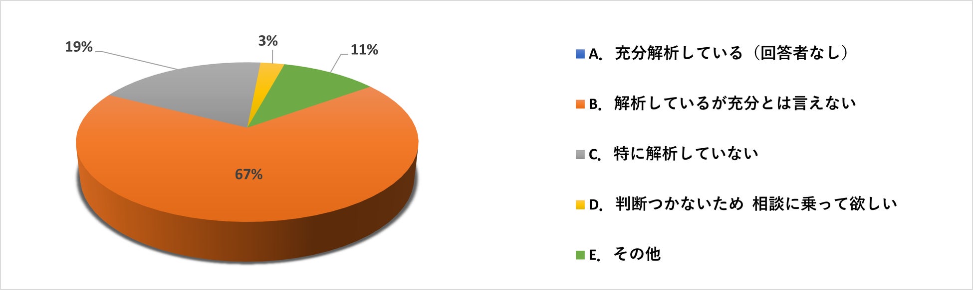 取得した資料請求名簿に対しての分析やホームページ解析についてのアンケート集計を行った結果、分析や解析を実施しているものの大多数が充分とは言えないと回答されていました。