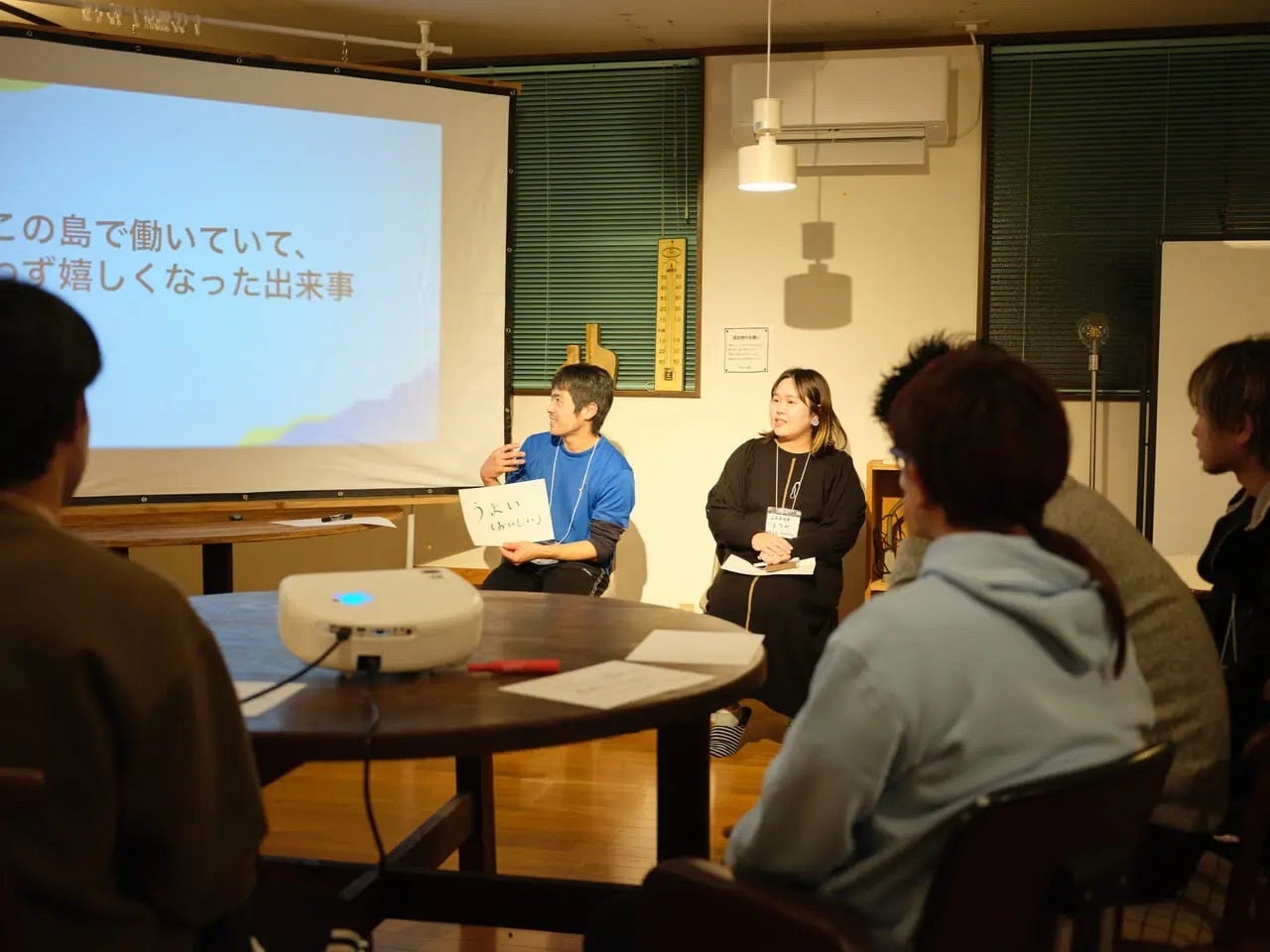 訪問看護師、五島手延うどん製造業者、移住者、若者らが肩書きを外し、「同じ島に暮らす一人の人」として語り合いました。