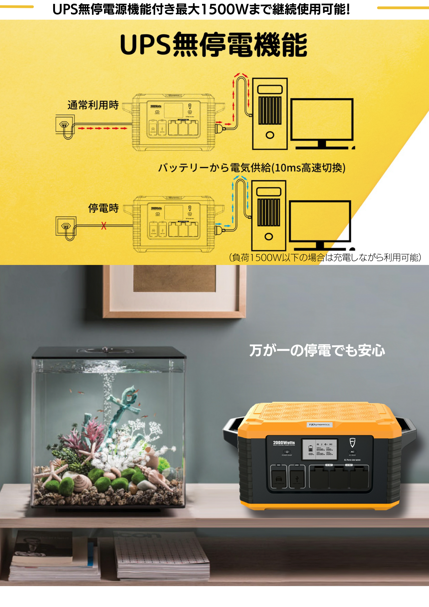 ・UPS無停電電源機能付き最大1500Wまで継続使用可能(1500W以下の場合は充電しながら利用可能)