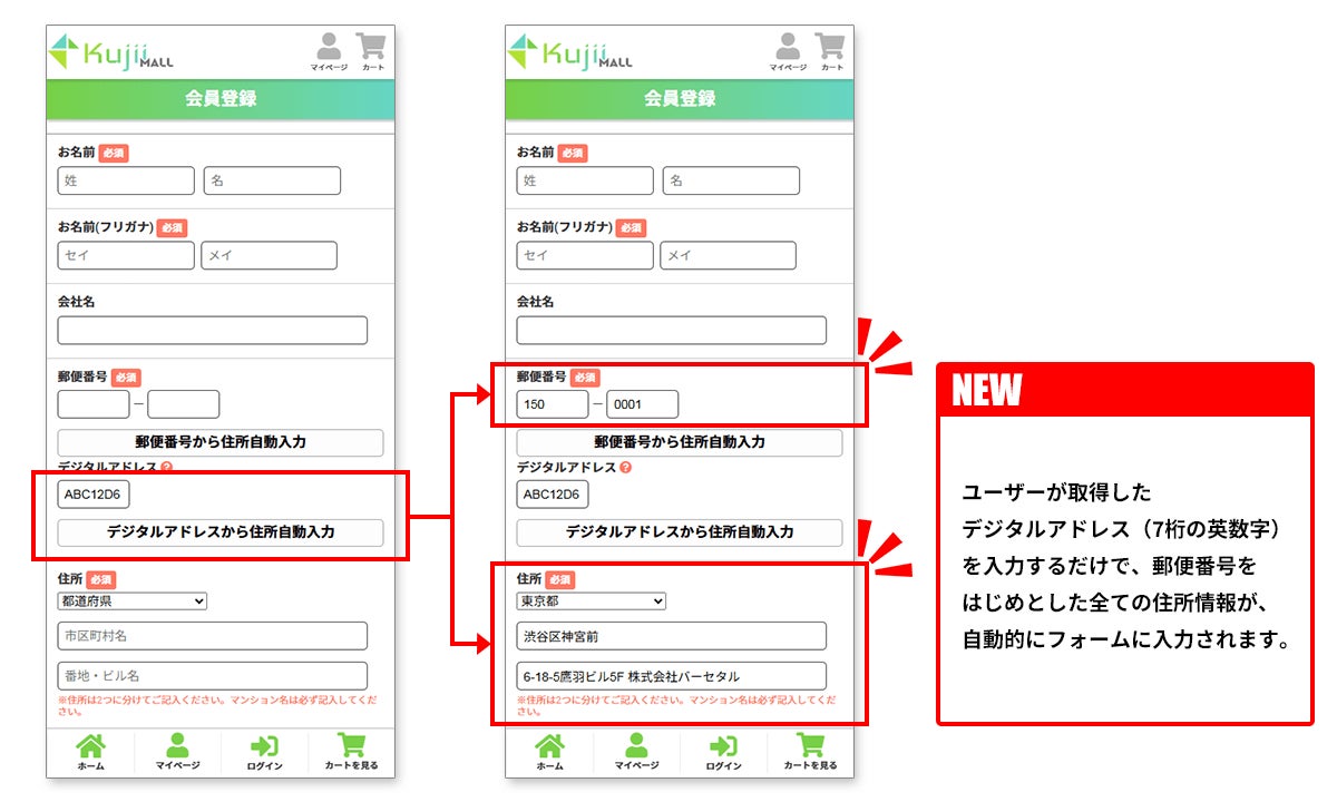 2025年5月27日(火)より、会員登録、配送先登録時にデジタルアドレス(7桁の英数字)を入力することで簡単に住所を登録することができる機能を追加いたしました。