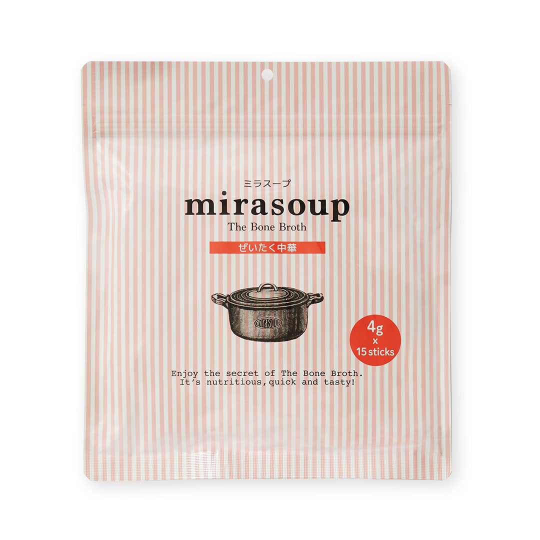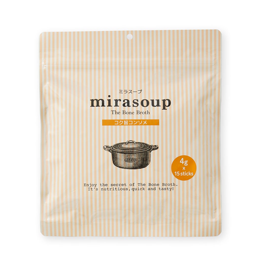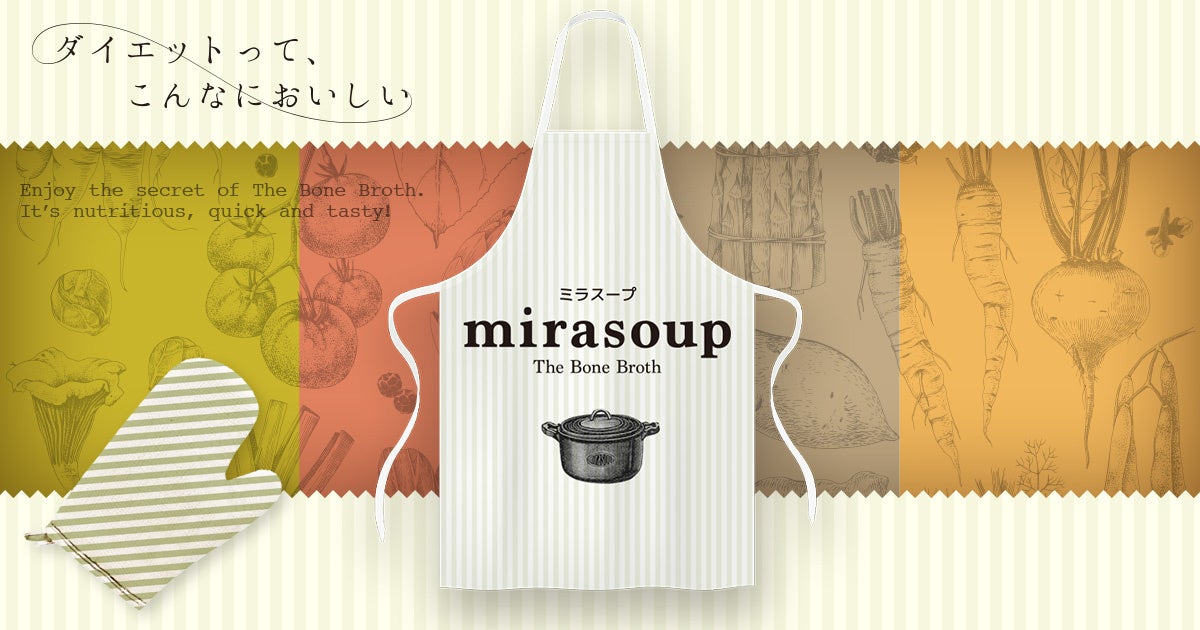 『mirasoup』は「ポジティブなダイエット」をコンセプトに、アメリカニューヨークで流行している牛や豚や鳥の骨を野菜やスパイスで煮込んだボーンブロススープに着想を得て開発。一日一食を1 杯 13キロカロリー*1の『mirasoup』に置き換えることで摂取カロリーを抑え、ダイエットをサポートするスープです。