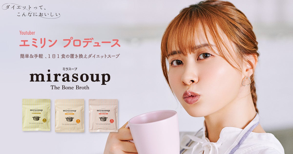 株式会社プレミアムコスメ(本社:東京都港区、代表取締役社長:森勇気、以下プレミアムコスメ)は、人気YouTuber・“エミリン”こと『大松 絵美』さんとの協働により、置き換えダイエットスープ『mirasoup』(ミラスープ)を、2022年10月26日(水)20:00より公式サイトにて発売いたします。