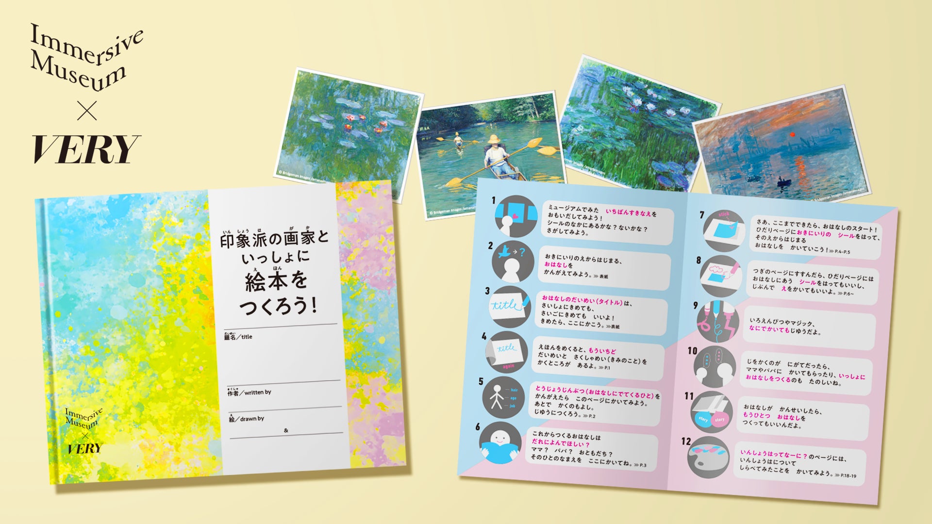雑誌「VERY」と共同制作を行い、「Immersive Museum」の体験から自分だけの絵本をつくる「絵本キット」を、小学生以下の入場者全員に無料配布します。「Immersive Museum」を題材にして、こどもたちが自由に物語を作るキットとなっており、付属する印象派絵画のシールを貼ることで、自分だけの絵本を作ることができます。