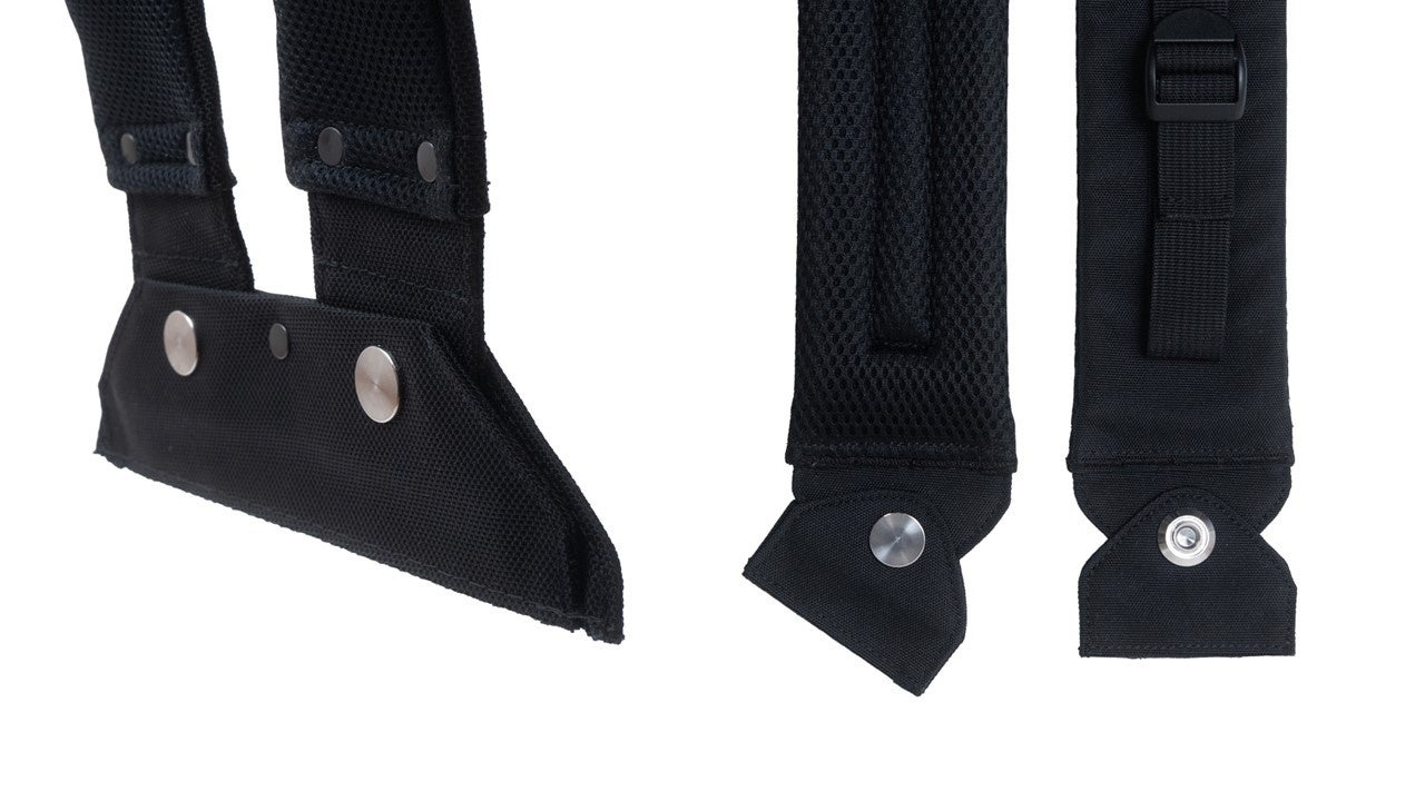 ②幅広い体型の肩幅にフィットする背負いベルト用の旋回接続部品「燕回 表・裏」(特許出願中)