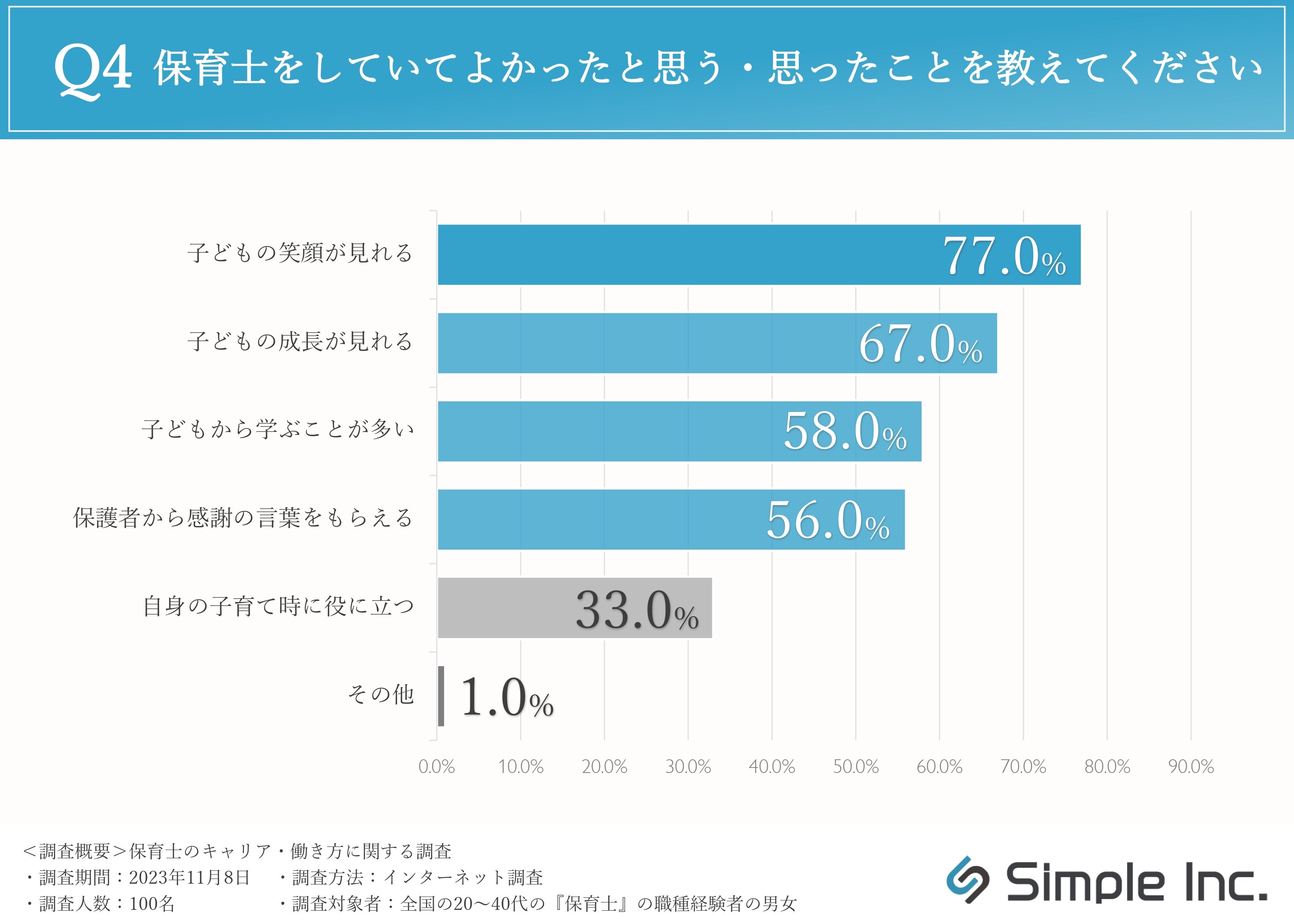 保育士をしていてよかったと思う・思ったことについて伺ったところ、「子どもの笑顔が見れる(77.0%)」「子どもの成長が見れる(67.0%)」「子どもから学ぶことが多い(58.0%)」といった声が集まりました。
