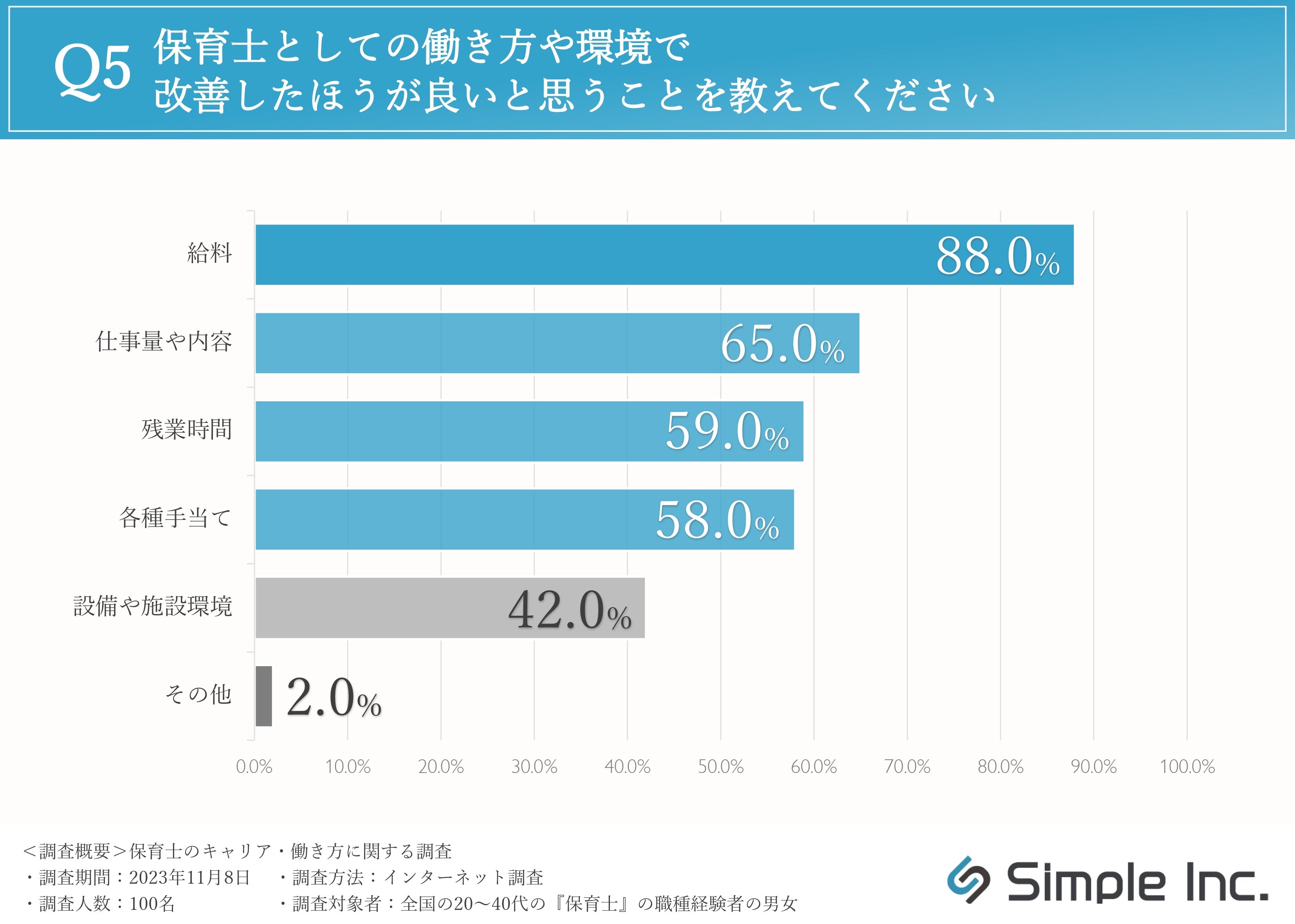 そこで、保育士としての働き方や環境で改善したほうが良いと思うことを伺ったところ、「給料(88.0%)」「仕事量や内容(65.0%)」という回答が上位に挙げられました。