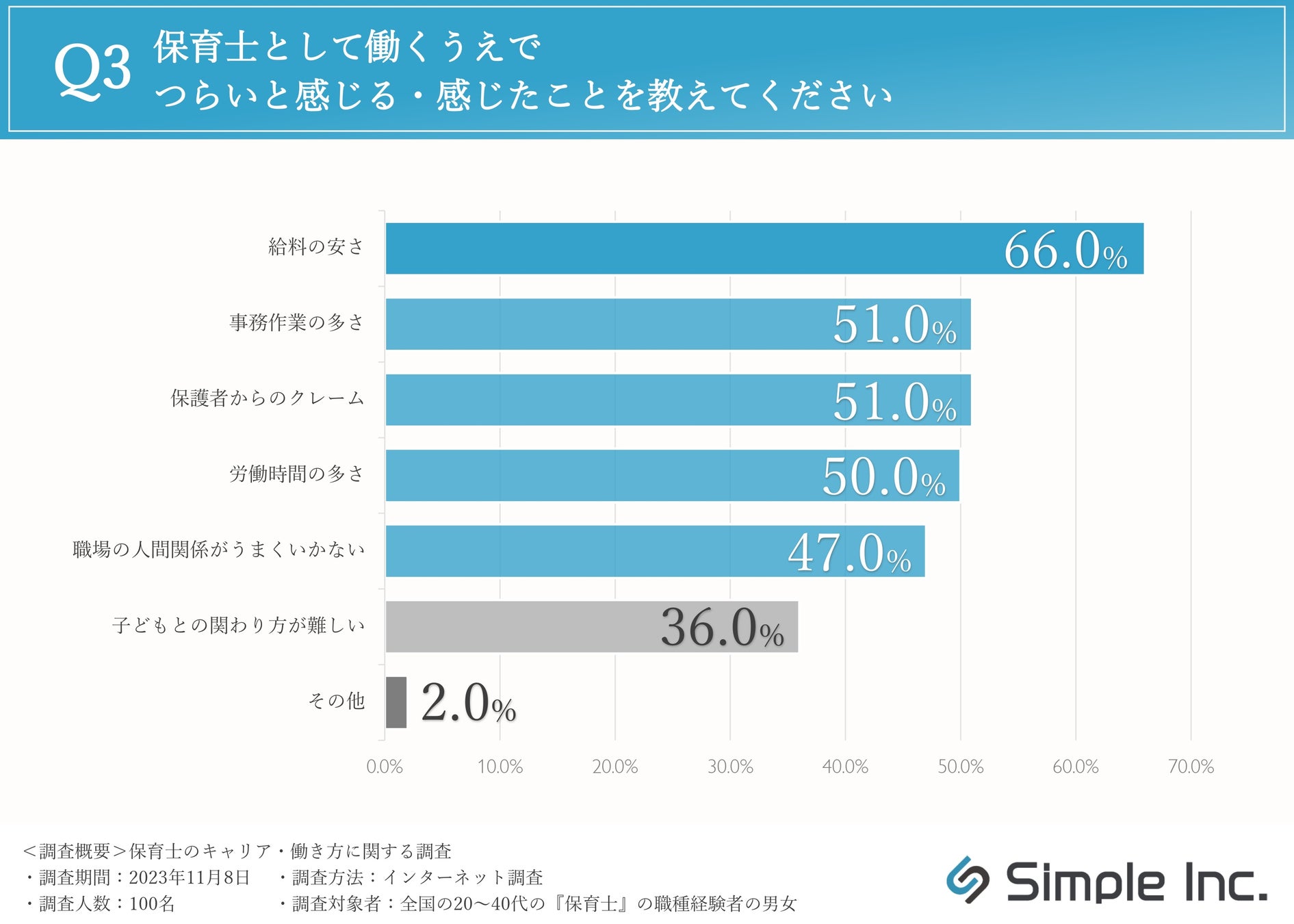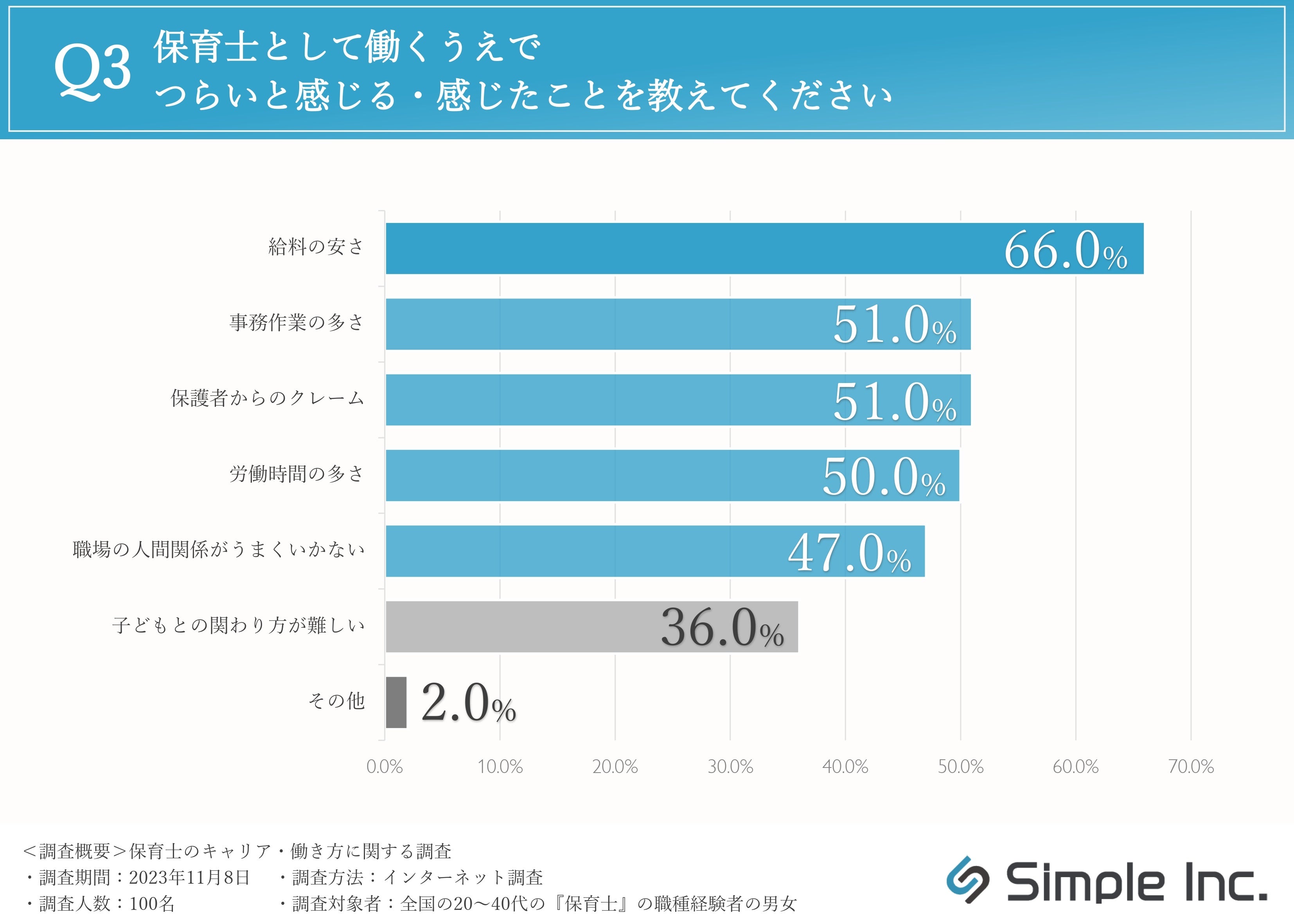 保育士として働くうえでつらいと感じる・感じたことを伺ったところ、「給料の安さ(66.0%)」と回答した方が最も多い結果となりました。