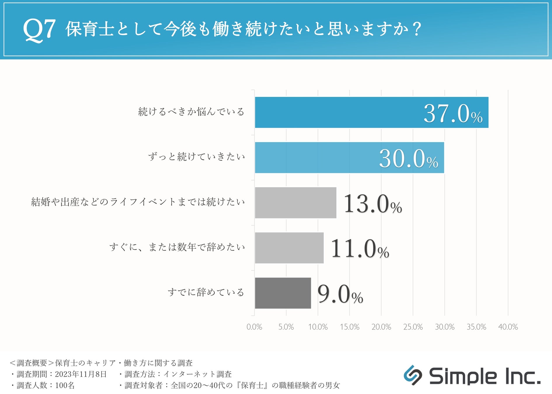 最後に、保育士として今後も働き続けたいか伺ったところ、「続けるべきか悩んでいる(37.0%)」という声が最も多かったものの、「ずっと続けていきたい(30.0%)」「結婚や出産などのライフイベントまでは続けたい(13.0%)」という声が合わせて4割ほど集まりました。