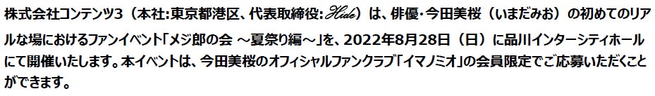 ファンクラブ「イマノミオ」会員限定チケット!500枚限定発売 今田美桜、初のリアルファンイベント「メジ郎の会 ~夏祭り編~」開催決定!-今田美桜 LINE NFTもチケット購入者に無料配布-