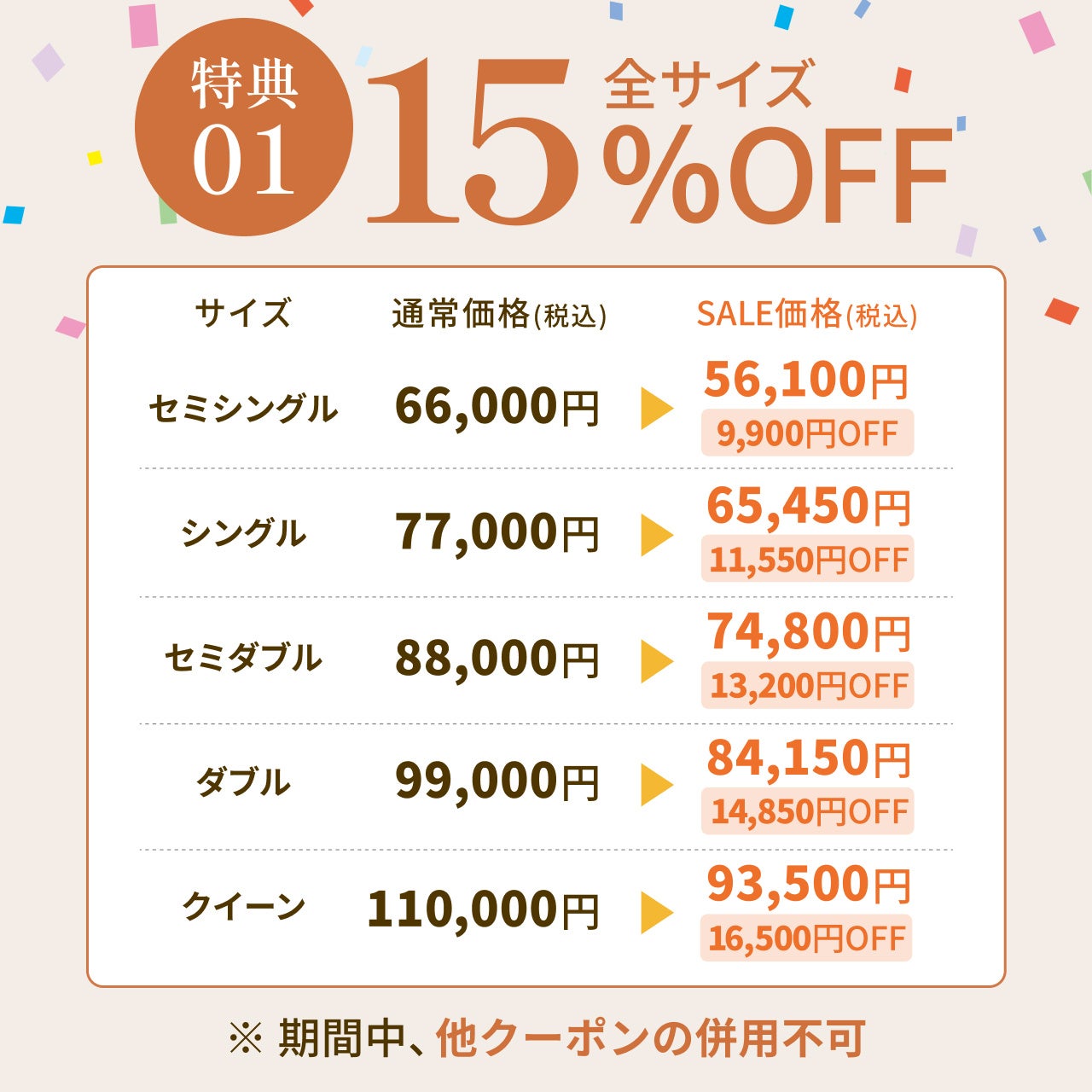 12/5(月)23:59まで、セミシングル〜クイーンサイズ 全5サイズが15%OFF+専用シーツプレゼント!