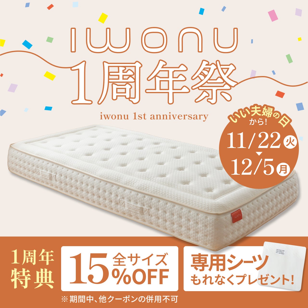 一人一人の寝心地にカスタマイズできる『IWONU マットレス(イウォーヌ マットレス)』を販売する北沢株式会社(本社:大阪府大阪市、代表取締役:北沢進志)は、11月22日(火)12:00より「IWONU 1周年祭」を開催いたします。『IWONU マットレス』全5サイズについて、期間中15%OFFでご提供&もれなく専用ボックスシーツをプレゼント!