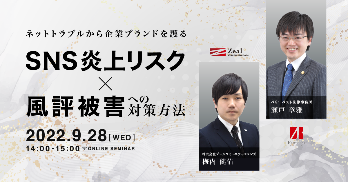 株式会社ジールコミュニケーションズ(所在地:東京都渋谷区東2-16-10、代表:薮崎 真哉)は、ベリーベスト法律事務所(所在地:東京都港区六本木1-8-7、代表:酒井 将)と、2022年9月28日(水)にオンラインセミナー、「ネットトラブルから企業ブランドを護る!SNS炎上リスク x 風評被害への対策方法」を開催いたします。企業としてSNSの運用を検討・開始している方や、ネガティブな投稿・実際の風評被害・誹謗中傷にお悩みの方、組織としてリスクマネジメントに取り組んでいる皆様におすすめのセミナーとなっております。