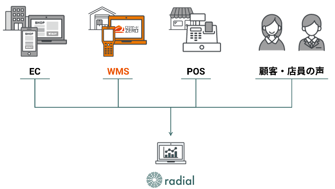 - radialがロジザードZERO内の在庫データと、その他のデータ(ECやPOS、生の声)を合わせて自動集計・分析し、意思決定のための前提情報をリアルタイムに表示する(意思決定の質・スピードの向上)