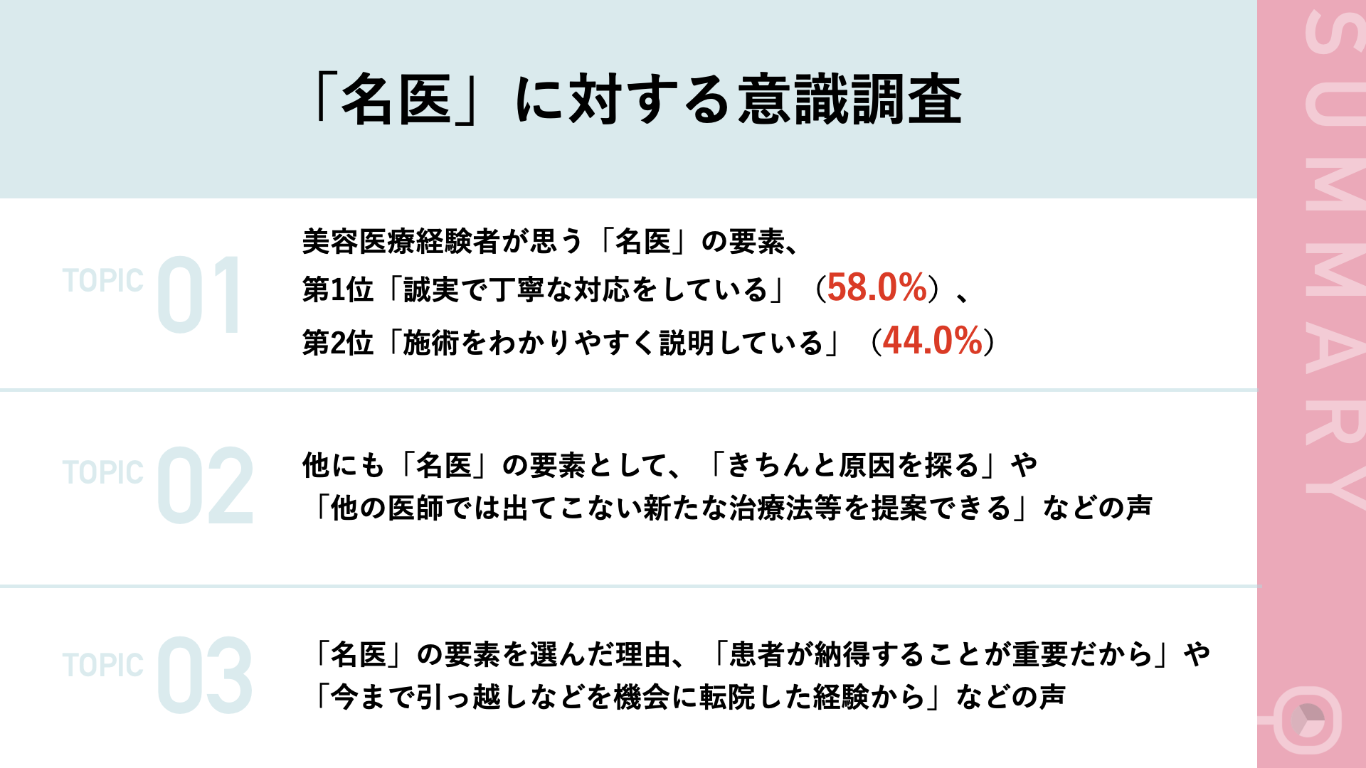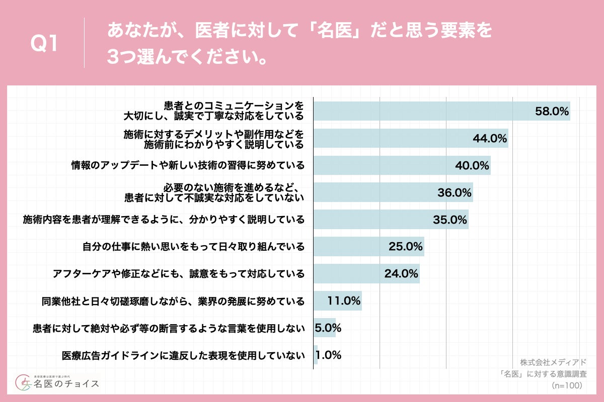 新メディア「名医のチョイス」が美容医療経験者100名に名医の条件を調査!第1位は「誠実で丁寧な対応」(58.0%)