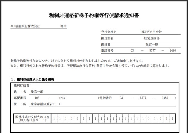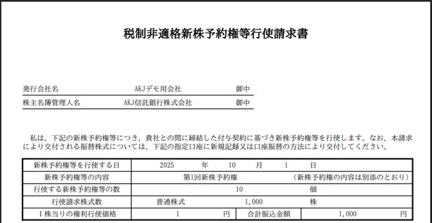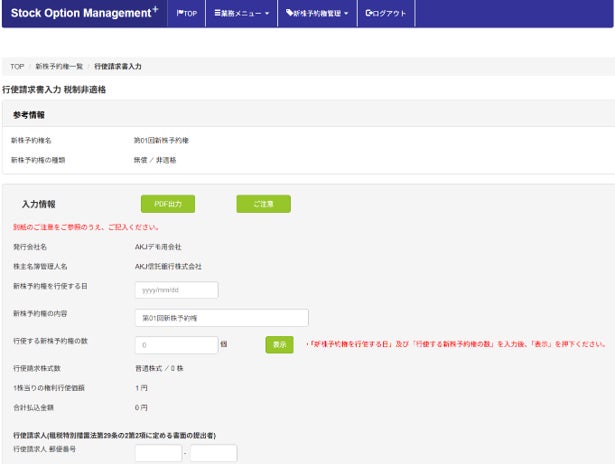 権利者(役員・従業員等)は、システム上で必要な情報を入力することで、新株予約権行使請求書を作成することが可能となります。
