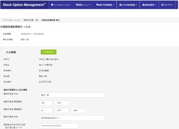 税理士法人AKJパートナーズ(所在地:東京都港区、代表社員:山本成男)は、ストック・オプション(SO)管理システム「Stock Option Management+」上で、「新株予約権行使請求書」及び「新株予約権行使請求通知書」の作成に係る実務負担を軽減させる新機能をリリースしました。