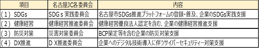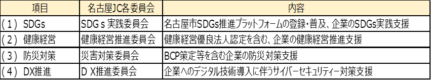 名古屋青年会議所と東京海上日動が緊密な相互連携を図り、双方の資源を活用した事業に協働で取り組むことにより、SDGs推進、健康経営・防災・DX推進の4分野での推進を図ります。