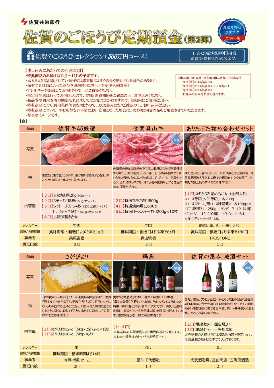 本キャンペーン期間中に「佐賀のごほうび定期預金第2弾」にお預入れいただいたお客さまは、佐賀県の名産品を集めたカタログの中からお好きな特典を選んでいただけます。さらにお預入れの口数に応じて、より特別な特典をお選びいただけます。