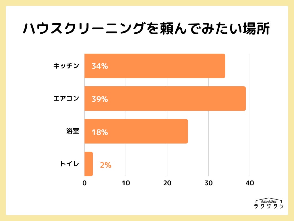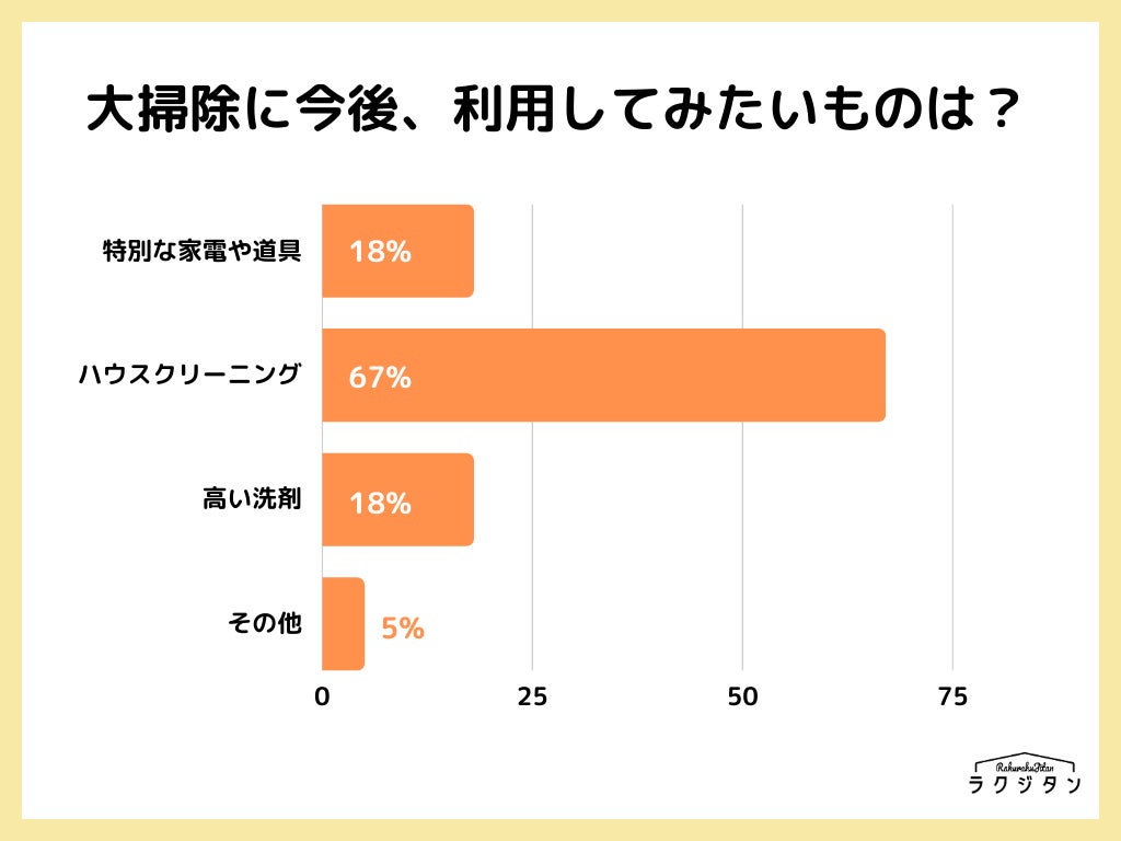 しかし、今後利用してみたいものを聞いてみると、ハウスクリーニングが67%でダントツの1位!使ったことはないけれど、気になっている人はとても多いことが数字に表れています。