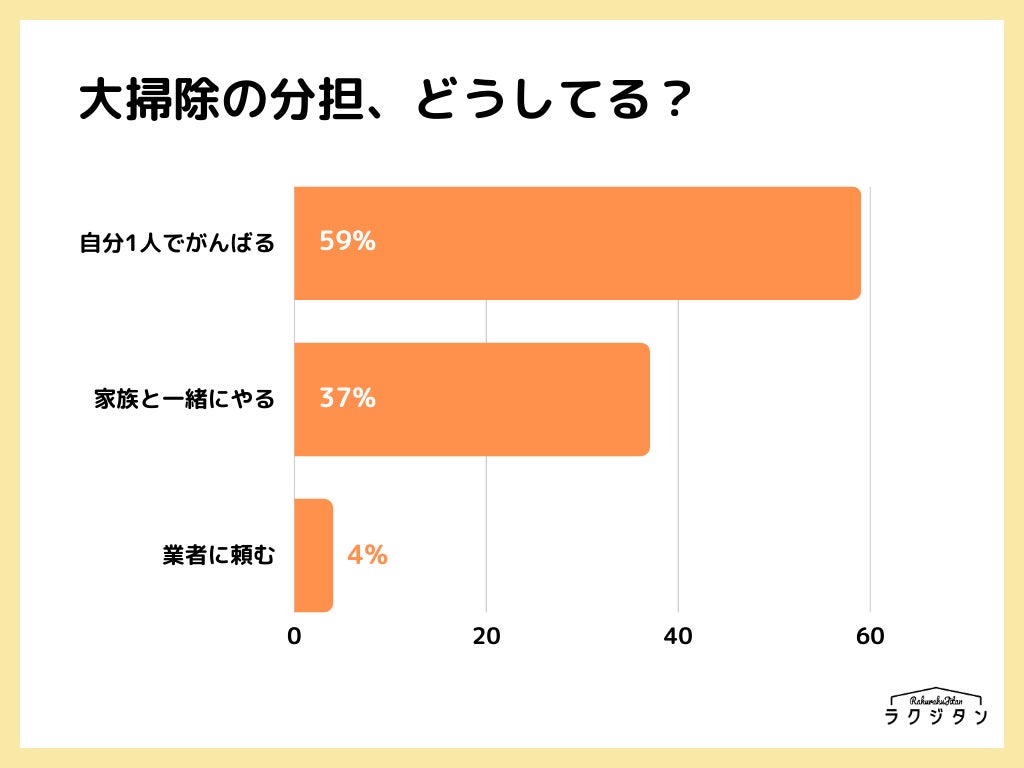 大掃除の分担について、いつも自分1人でやっている!という人が59%と過半数を越えました。家族が手伝ってくれる人が37%いるとはいえ、孤独に掃除を頑張っている女性が多いようです。