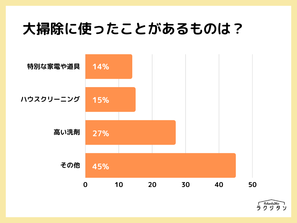 ハウスクリーニングや高い洗剤などを利用している人は42%にとどまり、あまりお金や手間をかけず、普段の掃除の延長線上で大掃除をやる方が多い印象です。