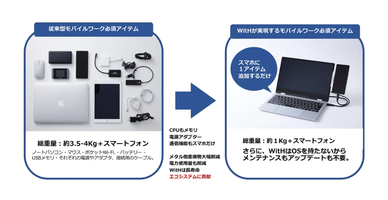 スマートフォンがPCのように使えるようになる新しいデバイスWitHは、ミニマムなデバイスで仕事環境を構築したいと考えるサスティナブル思考のモバイルワーカーや、リモート授業を受講する学生に注目されているデバイス。