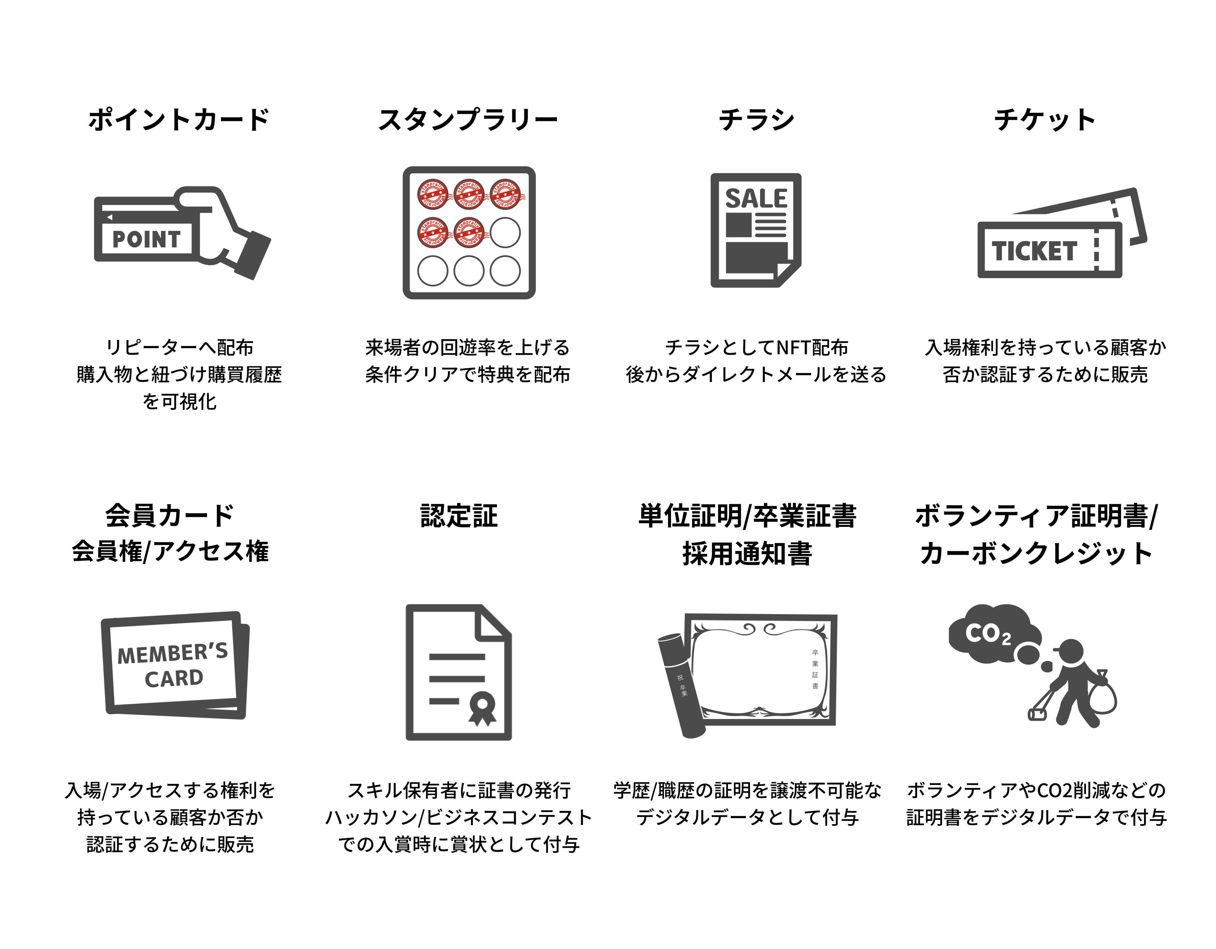 BADGEは、”NFTを配って終わり”ではありません。作成・配布後に、顧客がそのBADGEを発行・認証することで、その企業が提供する特典を受けることができたり、割引されるなどオンライン、オフライン関わらずBADGEを保有することで、様々な場面で恩恵を享受することが可能となります。